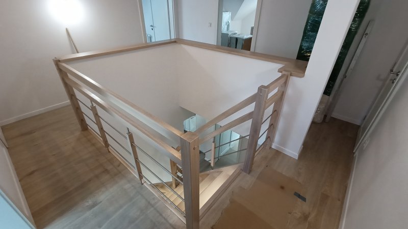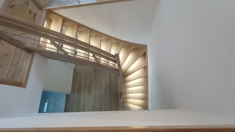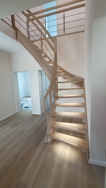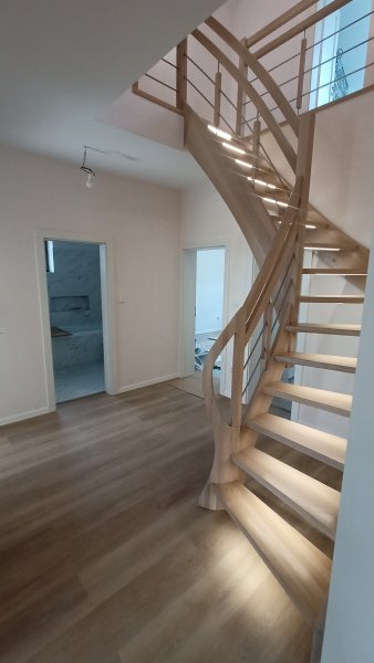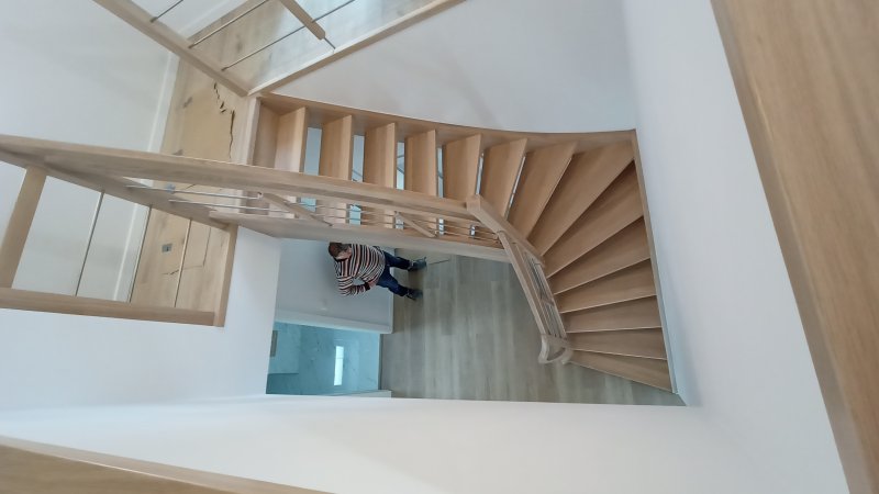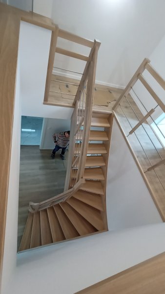 Pre rodinný dom v Sabinove sme realizovali interiérové schody na mieru, ktoré spájajú kvalitné remeselné spracovanie, funkčnosť a moderný dizajn. Schodisko je vyhotovené zo svetlého masívneho dreva, ktoré krásne ladí s podlahou a celkovým štýlom interiéru.