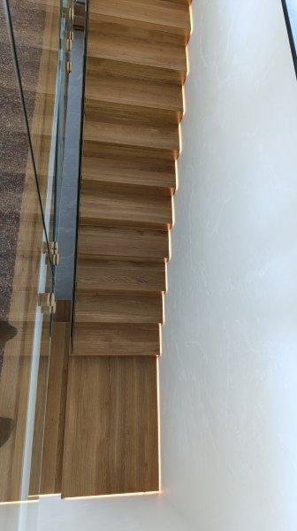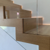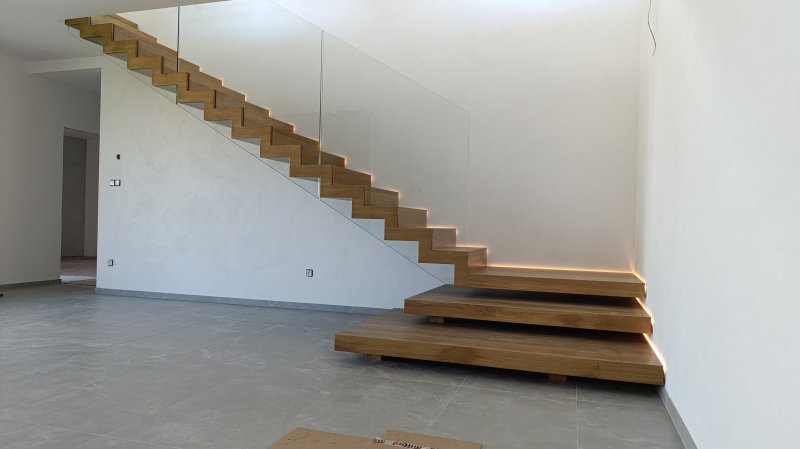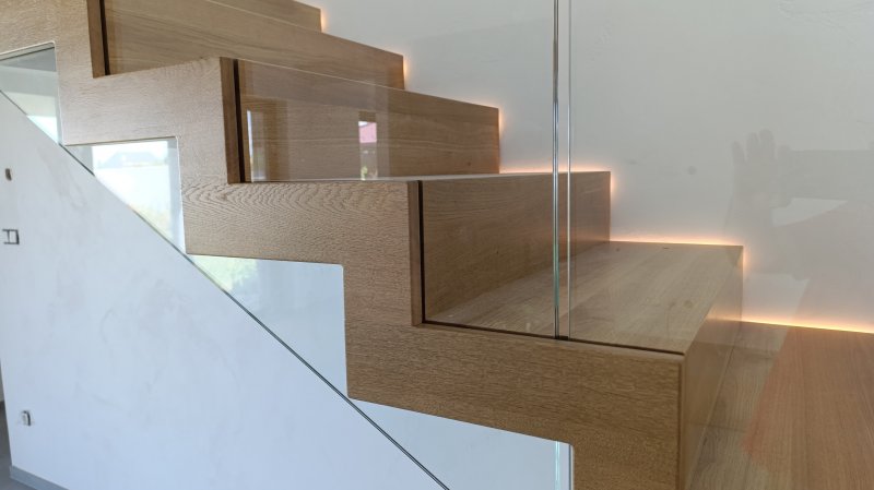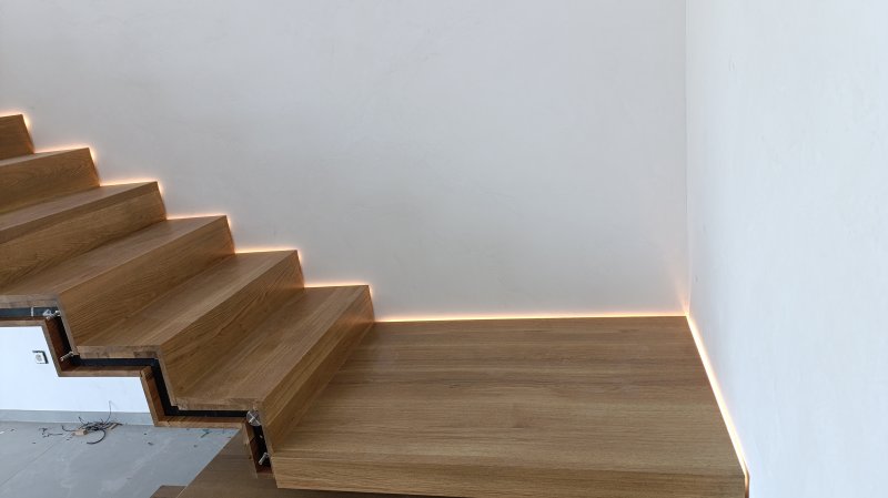 Výrazným prvkom tejto realizácie je nepriame LED podsvietenie, ktoré jemne kopíruje líniu schodov a podesty. Osvetlenie zvyšuje bezpečnosť pohybu po schodisku a zároveň dotvára príjemnú atmosféru v interiéri počas večerných hodín.