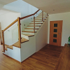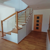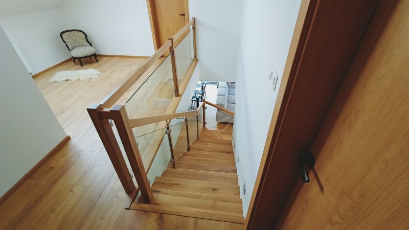 Dominantou tejto realizácie sú čisté línie a moderný dizajn, ktorý kombinuje drevo s elegantnou sklenenou výplňou zábradlia. Táto kombinácia dodáva schodom vzdušnosť a zároveň zabezpečuje dostatok svetla v priestore schodiska.