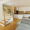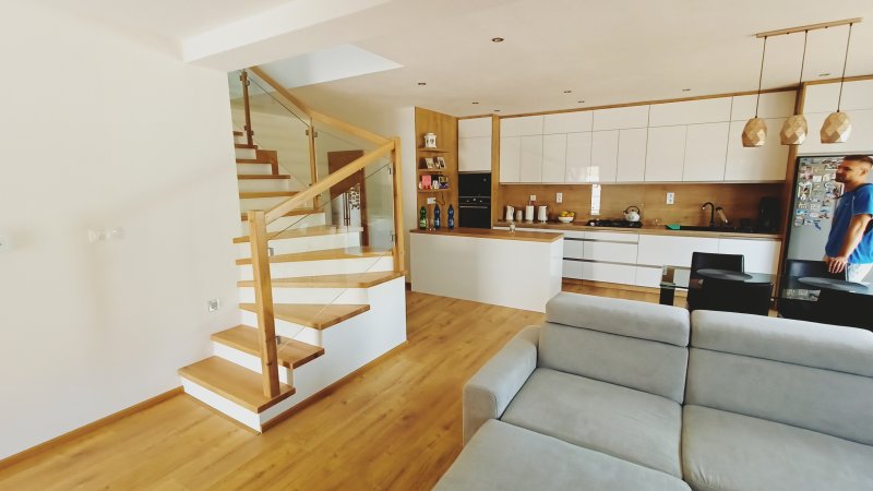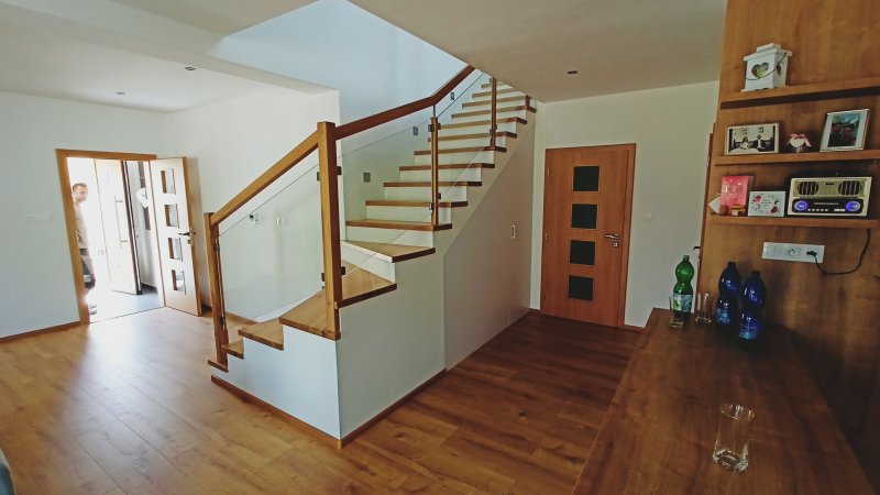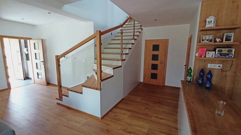 Pre rodinný dom v obci Odorín pri Spišskej Novej Vsi sme realizovali moderné interiérové schody na mieru, ktoré dokonale zapadajú do otvoreného priestoru dennej časti domu. Schodisko je vyhotovené z kvalitného masívneho dreva, ktorého prirodzená farba krásne ladí s podlahou a ostatnými drevenými prvkami v interiéri.