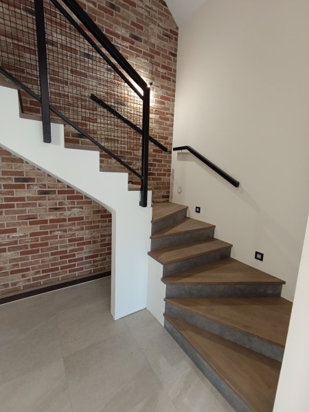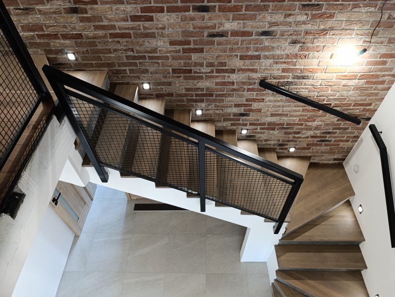 Realizácia interiérového schodiska v obci Harichovce pri Spišskej Novej Vsi predstavuje spojenie moderného dizajnu, precíznej stolárskej práce a industričných prvkov. Schody boli navrhnuté na mieru tak, aby prirodzene zapadli do interiéru s tehlovým obkladom a vytvorili výrazný architektonický prvok domu.