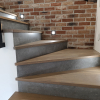 Výrazným dizajnovým prvkom je kovové zábradlie s výplňou z ťahokovu, ktoré podčiarkuje industriálny charakter schodiska a zabezpečuje bezpečný pohyb medzi podlažiami. Schodisko je doplnené o integrované bodové osvetlenie, ktoré zlepšuje orientáciu a zároveň dotvára atmosféru priestoru.